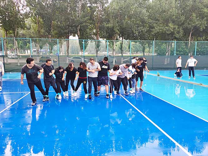 大家一排站好,從左到右,每人的右腿與另一人的左腿依次并齊,并用扁帶繩子系上,繩子綁的位置是腳踝以上部分。聽見哨聲即為游戲開始,從起點到終點,按用時由短到長,取前五名依次加分。